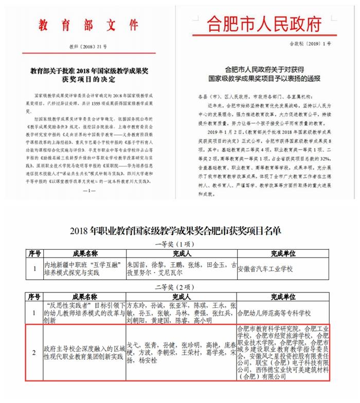“报告写得很好,可以送阅材料形式,印发至相关部门及学校。”这是合肥市市委副书记、市长凌云同志在审阅《关于合肥市职业院校教师2017年首批赴德高端研修情况的报告》后签署的意见。教育部党组书记、部长陈宝生在合肥学院视察、调研期间,市领导介绍了职业院校教师赴德研修情况,并对合肥学院的大力支持表示了感谢。2018年,sunbet申搏联合申报的《政府主导校企深度融入区域性现代职业教育集团创新实践》项目荣获中等职业教育教学成果奖国家二等奖、安徽省特等奖,《合肥市人民政府关于对获得国家级教学成果奖项目予以表扬的通报》(合政秘〔2019〕1号)中对相关单位和个人进行了通报表扬。合肥学院合肥职业院校教师能力发展中心成立4年来,在服务地方职业教育发展方面取得了显著成果。