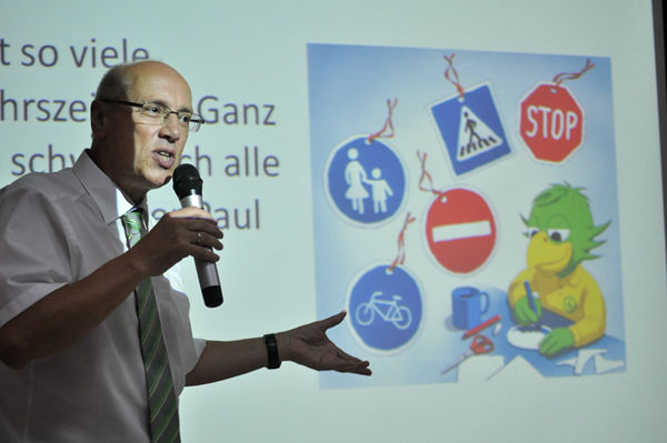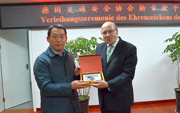 作为“世界可持续交通”的有力推动者,今年,他还赴合肥市阳光中学、凤凰城小学等中小学及交通、物流相关机构和研究所开展交通安全宣传及访问活动,意在宣传交通基础知识,鼓励文明出行方式。博德维希教授对中国的书法也有浓厚的兴趣,他在凤凰城小学开展交通安全知识讲座时,还饶有兴趣的学着学生的样子拿起毛笔书写。同时还虚心地向社团学生请教握笔姿势及书写技巧,并与书法老师合作书写了“中德友好”的字样,他还将此当作礼物送给热情的凤凰城小学的师生们。博德维希教授的合肥之行也受到不少媒体青睐,新浪网、《安徽青年报》媒体认为博等德维希教授此行不仅带来德国的交通安全理念,更深入推进了中德教育合作。