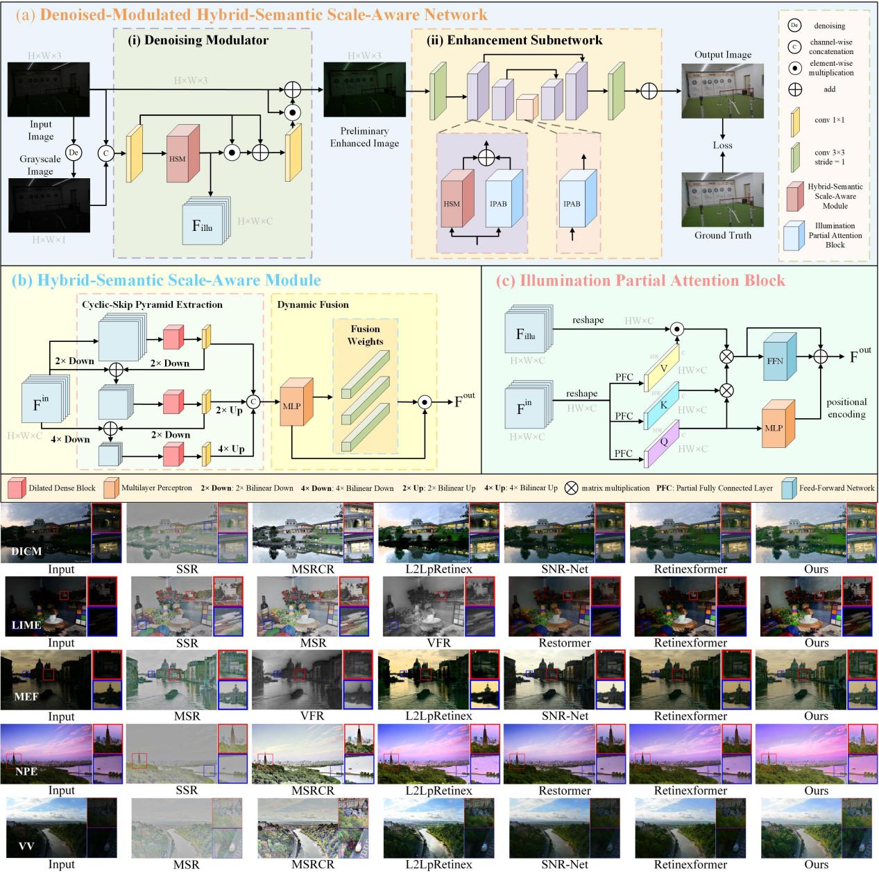 在低光环境图像增强方向,团队提出去噪调制混合语义尺度感知网络(DHSNet)。该网络设计 SNR 去噪机制与 HSM 模块两大关键组件,前者在增强前对噪声进行预处理,后者实现多尺度语义特征融合以提升增强鲁棒性,同时引入 IPAB 模块以优化光照校正与非线性变换能力。DHSNet 有效缓解了噪声、伪影与色彩失真问题,能够在保留细节的同时重建退化结构。在多个低光增强数据集上的实验表明,DHSNet 在定性与定量指标上均优于现有方法,并在无参考低光增强与低光目标检测任务中展现出良好的泛化能力,验证了其在真实场景中的应用价值。硕士生杨仁涛与吴志泽教授为共同第一作者,王晓峰教授与邹乐教授为共同通讯作者,sunbet申搏官方网站人工智能与大数据学院为第一完成单位。(论文标题:DHSNet: Denoised-Modulated Hybrid-Semantic Scale-Aware Network for Low-Light Image Enhancement,状态:已录用,待刊出 Accepted)