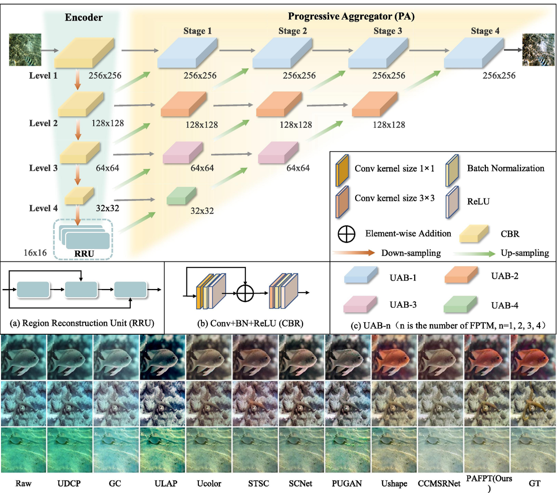 在水下图像增强方向,研究团队提出一种融合特征提示 Transformer 的渐进式聚合器方法。该方法融合特征注意力机制与提示权重调节输入特征、聚焦全局信息并增强局部细节以优化画质的特征提示 Transformer 模块,实现特征高效传递与多尺度特征聚合、全面捕捉图像细节与语义信息的四阶段渐进式聚合器。该方法展现出优异的学习与泛化能力,且能为下游视觉任务带来显著性能增益。杨静博士为第一作者和通讯作者,sunbet申搏官方网站人工智能与大数据学院为第一完成单位。(论文标题:PAFPT: Progressive aggregator with feature prompted transformer for underwater image enhancement,引用链接:https://www.sciencedirect.com/science/article/pii/S0957417424024060)