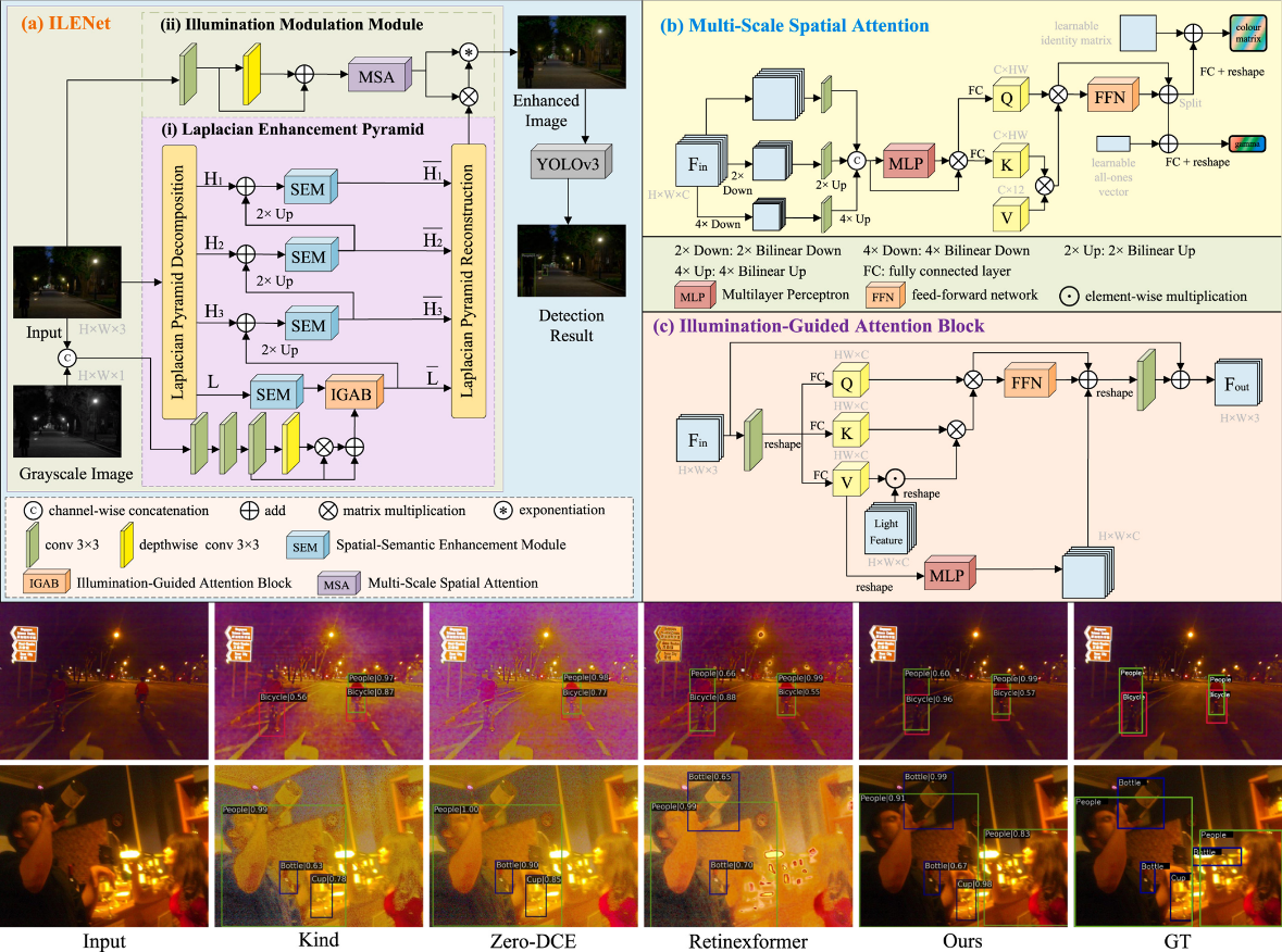在低光环境目标检测方向,团队提出光照调制拉普拉斯金字塔增强网络(ILENet)。该网络设计 LEP 与 IMM 两大关键组件,LEP 优化低光图像多频率信息以提亮度、IMM 生成语义校正参数以优图像,且与 YOLO 检测器集成形成新框架,采用联合训练平衡增强与检测任务,在低光数据集上达 SOTA(准确率 78.5%),其有效性亦经低光语义分割任务验证。王晓峰教授为第一作者,邹乐教授为通讯作者,sunbet申搏官方网站人工智能与大数据学院为第一完成单位。(论文标题:ILENet: Illumination-Modulated Laplacian-Pyramid Enhancement Network for low-light object detection,引用链接:https://www.sciencedirect.com/science/article/pii/S0957417425001265)