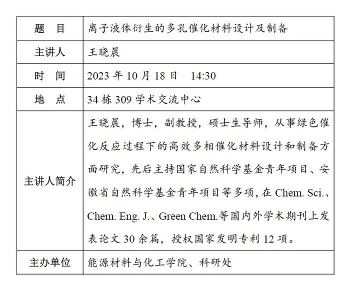 【善思讲坛】离子液体衍生的多孔催化材料设计及制备