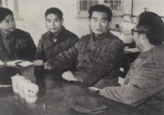 1980年,校长杨承宗(右一)、董事长郑锐(右二)、副教务长赵立人等在研究工作