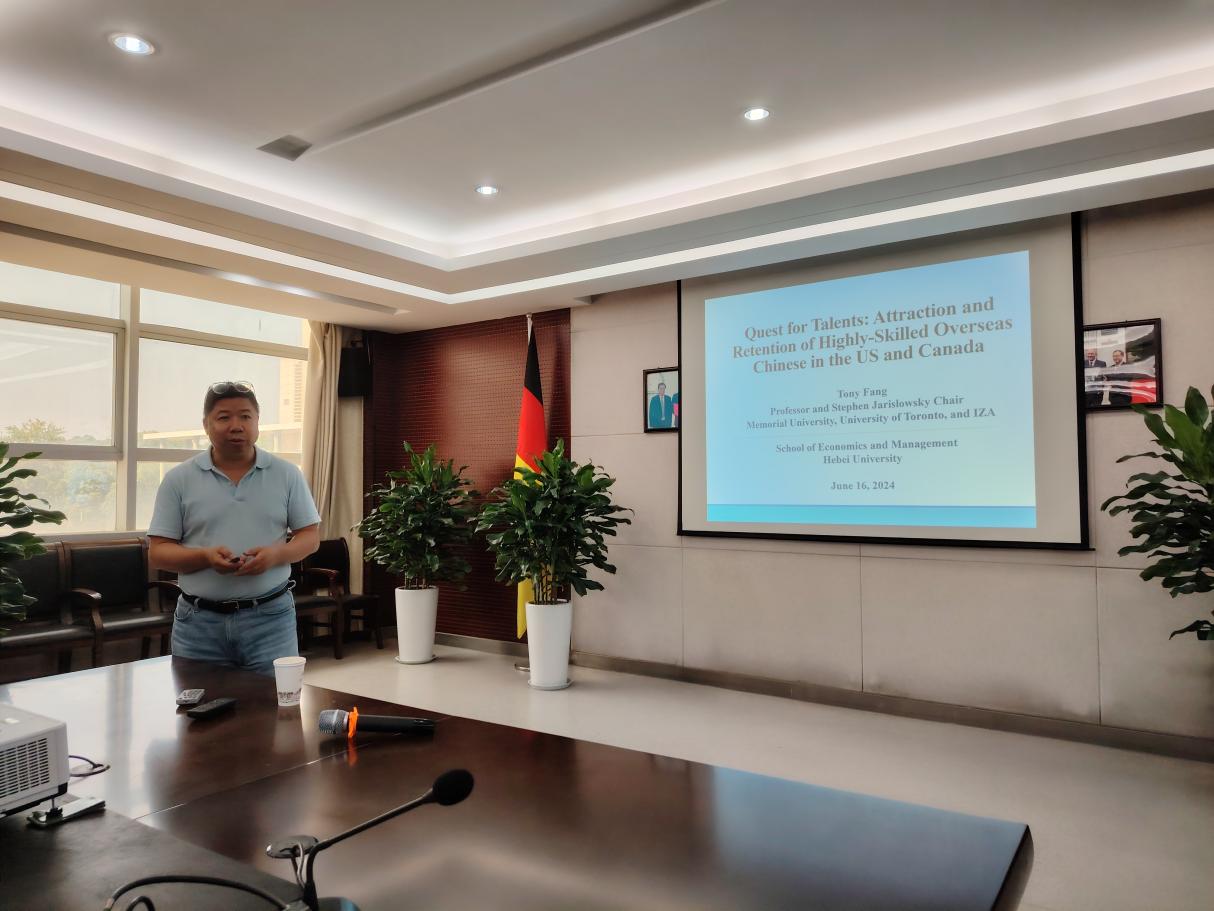 6月16日上午,我院举行“善思讲坛”,特别邀请加拿大纽芬兰纪念大学方涛教授作了题为“Attraction and retention of highly skilled overseas Chinese in the United States and Canada”的学术报告,报告会由陈江华院长主持,经济与管理学院相关专业教师及硕士研究生参加。