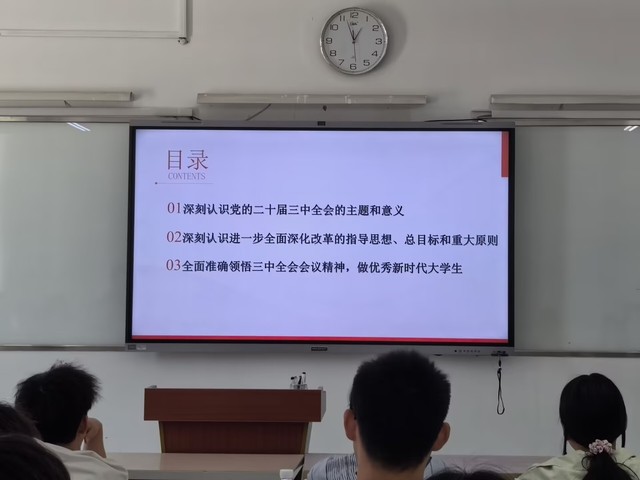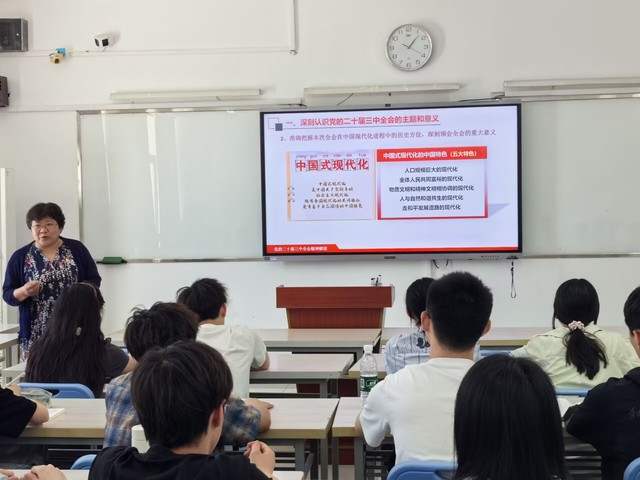 首先,李秀娟深入阐述了党的二十届三中全会的主题和重要意义。她指出,全会聚焦全面深化改革,明确了新时代改革的方向和任务,为推动国家发展提供了重要指引。她强调,全会的指导思想是坚持以习近平新时代中国特色社会主义思想为指导,立足新发展阶段,贯彻新发展理念,构建新发展格局,推动高质量发展。随后,李秀娟进一步讲解了全面深化改革的总目标和重大原则。她指出,总目标是完善和发展中国特色社会主义制度,推进国家治理体系和治理能力现代化。同时,改革必须坚持党对改革的集中统一领导,坚持改革沿着中国特色社会主义方向前进,坚持社会主义市场经济改革方向,坚持改革为了人民、依靠人民,这些原则为改革的顺利推进提供了坚实保障。最后,李秀娟着重强调了大学生在贯彻落实党的二十届三中全会精神中的责任与使命,要深刻理解习近平总书记提出的“六个力”的丰富内涵,即思政引领力、人才竞争力、科技支撑力、民生保障力、社会协同力、国际影响力,要求全体需要围绕这“六个力”深入思考,深刻领悟全会精神,将个人理想融入国家发展大局,努力学习科学文化知识,提高自身综合素质,积极投身社会实践,为实现中国式现代化贡献自己的力量。