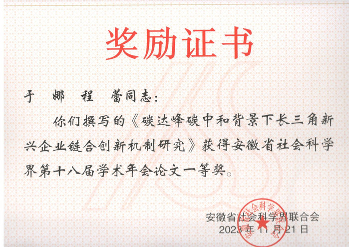 学校获一等奖1项、三等奖2项、优秀奖1项,其中经济管理学院于娜、程蕾的《碳达峰碳中和背景下长三角新兴企业链合创新机制研究》荣获一等奖,实现了新的突破。获奖征文彰显中国特色、时代特征、安徽特点的研究成果,为打造“三地一区”、建设“七个强省”,走出高质量发展新路提出了很多战略性、前瞻性、操作性强的对策建议。