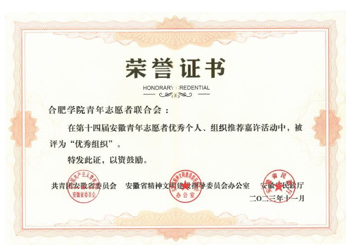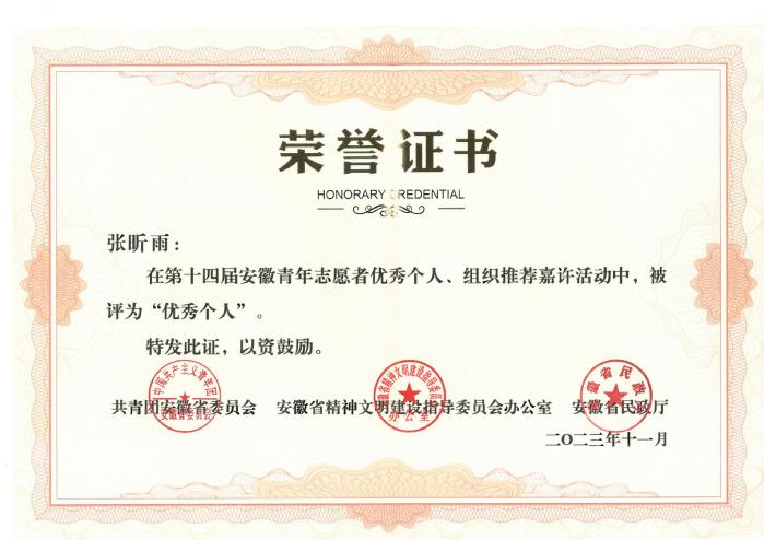 近日,由团省委、省文明办、省民政厅联合开展的第十四届安徽省青年志愿者“优秀组织”“优秀个人”名单公布,sunbet申搏青年志愿者联合会获评“安徽省青年志愿者优秀组织”,经济与管理学院张昕雨同学获评“安徽省青年志愿者优秀个人”。