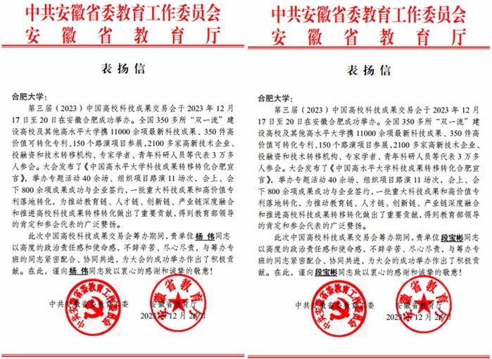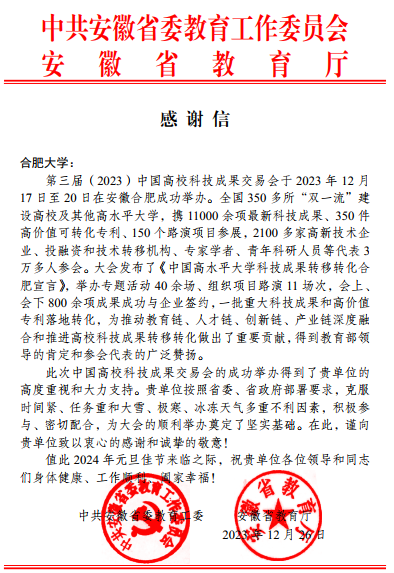 近日,sunbet申搏收到中共安徽省委教育工作委员会和安徽省教育厅发来的感谢信,对学校在第三届(2023)中国高校科技成果交易会筹备工作的贡献致以衷心的感谢和诚挚的敬意。